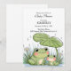 Uma ilustração animadora de um sapo pai e sapo bebê sentados juntos sob uma grande almofada de lírio, ficando seco das gotas de chuva em queda. Cercados por flores e grama, os sapos sorriem felizes, suas bochechas rosadas brilhando de alegria. Esta cena bonita captura o amor e o calor de um dia chuvoso na natureza.