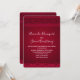 Um convite de casamento com um fundo vermelho projetado com espirais elegantes e floreios ao longo das bordas.