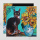 Gato preto expressivo e branco, girassóis coloridos e folhas verdes em cores azul-amarelo e azul-turquesa. Pintura acrílica original, artística e vibrante, em painel de madeira, de Búlgaro Lumini (c)