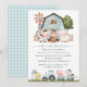 Invite friends and family in style and set the tone for your special day with this charming birthday invitation. Design features farm animals (cow, horse, sheep, pig, rooster, chicken), blue barn and blue tractor on white background.