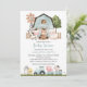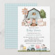Invite friends and family in style and set the tone for your special day with this charming baby shower invitation. Design features farm animals (cow, horse, sheep, pig, rooster, chicken), blue barn and blue tractor on white background.