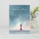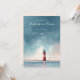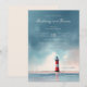 Este convite de casamento apresenta um tema de praia serena com um farol como ponto focal, colocado contra um céu gradiente que transita de azul suave para tons mais claros perto do horizonte. A paleta de cores inclui azuis suaves, cinzas, bege arenoso e vermelhos para as listras do farol, criando uma atmosfera tranquila e romântica. Tipografia elegante é usada em todo o convite, com seções personalizáveis para nomes, datas e locais, garantindo personalização enquanto mantém um layout limpo e sofisticado. O design evoca uma sensação de calor e intimidade, perfeito para casais que desejam celebrar seu dia especial em um ambiente costeiro.