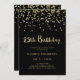 Este glam, elegante convite de aniversário 25 apresenta confete de ouro falso e tipografia correspondente em um fundo preto.