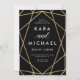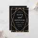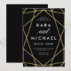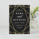 Estes elegantes convites de casamento glam têm um fundo preto escuro e um design geométrico moderno de ouro falso. Todo o seu texto está em branco.