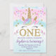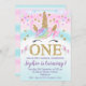 Faux Dourado One Unicorn Rainbow primeiro aniversario Invitation Cute unicorn convite de primeiro aniversário com um pouco de bambo. Este design apresenta um rosto unicórnio, duas nuvens, algumas estrelas de coração e douradas falsos, e dois pequenos unicórnios. O fundo inclui um arco-íris azul e rosa esmaecidos. O mágico convite de primeiro aniversário do unicórnio arco-íris desta menina é ideal para o primeiro aniversário de uma menina.