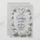 This design showcases a luxurious, monochromatic composition featuring a faux embossed border of sculpted roses and botanical scrollwork in shades of creamy ivory and white. At the header, a romantic silhouette couple is framed by an intertwined heart motif, creating a sense of historical romance. The typography combines sweeping black calligraphy for names with structured serif fonts for ceremony details, set against a clean neutral background to maximize readability. This is a flat printed image with a Faux Embossed effect, not actual raised material.