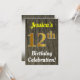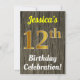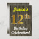 Este design convite de aniversário apresenta uma mensagem como "Celebração de Aniversário 12 de Jessica!", onde o nome pode ser personalizado, e onde o número "12" tem uma aparência falsa de ouro. Ele também apresenta uma aparência rústica de madeira falsa. Os detalhes do evento no verso podem ser personalizados. Poderia ser usado para convidar pessoas para a décima segunda festa ou festa de aniversário de alguém. [~Z0000119]