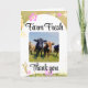 Compartilhe a sua gratidão com o encanto rústico usando esta Fazenda, Fresco. Obrigado, cartão dobrado. Apresentando um design inspirado no país, é perfeito para fazendeiros, fazendeiros de quintais, proprietários de pequenos negócios e qualquer um que queira enviar apreciação com calor e autenticidade. O cobrir da frente destaca elementos frescos de fazenda em um estilo rústico limpo, a dentro da esquerda permite espaço para uma foto ou ilustração significativa, e a dentro da direita dá espaço para o obrigado personalizado que você envia a mensagem. Com antecedentes e motivos naturais personalizáveis, este cartão é ideal para vendedores de mercado de agricultores, proprietários de pequenas empresas ou como um recinto de presentes ponderado.
