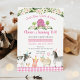 Este belo convite de aniversário apresenta animais de fazenda aquosos com sotaques florais cor-de-rosa, confetti e borda cor-de-rosa.