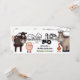 Este belo convite de festas de aniversário apresenta animais de exploração engraçados; uma vaca, um porco, um cavalo e um galo com fundo de fazenda preto e branco.