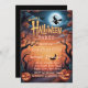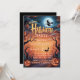 Convide seus hóspedes para uma comemoração espetacular com este convite de festa de Halloween encantador e assustador! A design capta a magia da noite de Halloween, apresentando uma cena clássica de bruxa voando sobre sua vassoura, silenciada contra uma grande lua de cheio luminosa. Colocada contra um dramático céu crepúsculo, a cena é enquadrada por árvores tortuosas e assustadas e uma floresta assombrada, criando uma atmosfera perfeitamente estranha. As lanternas brilhantes descansam no fundo, lançando uma luz quente e maliciosa. A tipografia do estilo vintage é totalmente personalizável para seus detalhes de eventos. Perfeito para qualquer reunião festiva e assustadora, de uma festa de fantasia infantil a uma festa de Halloween adulta. Personalize facilmente as informações de nome, data, hora, local e RSVP do host para criar o anúncio perfeito para o evento assombrado. Prepare-se para uma noite de diversão e medo!