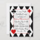 Convite preto e branco à moda do aniversário do teste padrão do harlequin, com os quatro ternos diferentes do cartão, em cada canto. O convite perfeito para um partido da noite do partido do casino. Personalize o texto para serir suas necessidades do evento.