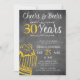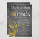 Animações informais e engraçadas e cervejas, homens com trinta cartas de convite de aniversário com um roteiro de tipografia de rico, uma caneca de cerveja amarela e rodopia sobre um fundo de quadro-negro de cinzas escuras e rústicas. ++++++++++++++ Adequado para qualquer festa de aniversário etária ou marco. Fácil de personalizar alterando a idade, o nome e os detalhes da festa!