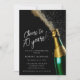 Um convite perfeito para 70 de aniversário para um homem ou uma mulher. Uma garrafa de champanhe aberta com bolhas de fuga cria um design festivo. O "Cheers to 70 anos" está escrito em uma escrita moderna e moderna. Os detalhes de aniversário seguem abaixo. O texto branco pop contra o fundo preto. Todo o texto pode ser editado para que você possa realmente artesanato uma experiência personalizada para seus convidados.