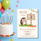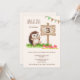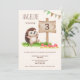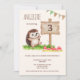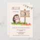 Convites de aniversário para crianças adoráveis, com um belo ouriço alegre, grama verde e cogumelo colorido no chão, bandeira de festa e um conselho de madeira com o número.