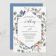 Aprecie seus convidados com este elegante convite floral de aquarela. Convite mostrando seus detalhes de casamento em uma estrutura geométrica cercada por delicada folhagem de cor d'água pintada com a mão e detalhes de flores delicadas em uma combinação graciosa de pincel, rosa pincel, marfim, rosa empoeirado, azul empoeirado e tons de sábio. Traseira de cartas num tom azul elegante e empoeirado. Parte da nossa coleção de casamento e eventos "Feliz Floral".