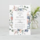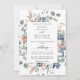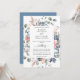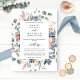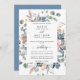 Aprecie seus hóspedes com este brilhante convite botânico floral, com um belo buquê de cor aquosa pintado à mão em uma bela folhagem verde e pequenos detalhes florais em uma mistura de pincéis, pêssego, marfim, coral macio, azul empoeirado e tons azuis. Coloque um quadro elegante com seus detalhes. Elementos de caligrafia modernos. O cartão está de volta em elegante sombra azul empoeirado. Parte da nossa coleção de Casamentos e eventos "Feliz Floral".