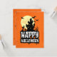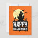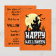 Feliz ilustração do design de texto de Halloween com decoração assombrada de casa, cemitério e morcegos na lua de cheio sobre fundo laranja grunge