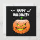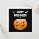 Feliz Cartão de Halloween com abóbora, morcegos e aranha com teia.