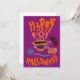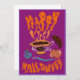 Ilustração original de uma xícara de café de bruxas com veneno, bruxa, morcego, abóbora, varinha mágica e pequenos fantasmas a vapor com a letra da mão dizendo Feliz Halloween. Em cor e estilo maximalista laranja e roxo e arrojado.