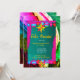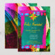 Convite de Feliz Navidad Festa com ornamentos coloridos de Natal mexicano em cima de uma moldura rosa brilhante. Apresenta a palavra Feliz Navidad em amarelo brilhante em uma superfície verde turquesa. Ao fundo do design, há uma fotografia de um sarape mexicano nas cores rosa, verde, vermelho e amarelo mexicanos. É um design alegre e vibrante para celebrar sua festa de Natal mexicana com as cores festivas do México.