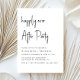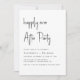 Convite mínimo moderno de recepção de casamento branca e negra, com a apresentação de "Feliz Nunca Depois da Festa" em um roteiro chic, seus detalhes em letras simples e seus primeiros nomes em tipografia serif clássica.