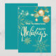 Felizes festas flocos de neve dourados e enfeites de Natal, flocos de neve, luzes de corda, cartão de convite verde de feriado moderno e elegante.
