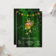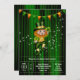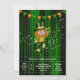 Uma ilustração divertida e moderna de um duende vestindo um chapéu com uma banda de ouro falsa; um colete e jaqueta. Ele tem uma barba laranja e está dançando um jig feliz debaixo de uma corda laranja e verde de colocar bandeiras e está segurando um trevo de shamrock em sua mão. Estrelas brilhantes brancas o cercam.