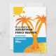 Convite para Férias de Verão da Reunião Familiar, com nome familiar e palmeiras personalizáveis. A design mostra sol, palmeiras, horizonte azul e praia brilhante ouro, com tipografia ousada. Simplesmente personalize este convite de reunião com o nome da família na frente e personalize seus detalhes de férias e instruções no verso. Obtenha presentes correspondentes para toda a família para fazer da sua próxima viagem um feriado para se lembrar.