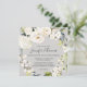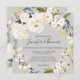 Com um popular esquema de cores neutro, este design de convite de casamento quadrado apresenta uma bela coroa de flores brancas de aquarela com um verde à direita sobre um fundo popular (bege cinza). As flores incluem rosas, híbridos e florais mistos correspondentes a um efeito de jardim fresco. Os emparelhamentos de texto usados neste design apresentam os nomes da noiva e do noivo de forma destacada usando um rosto de tipo manuscrito. Personalize o modelo de texto fácil de usar com seus detalhes de casamento.