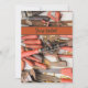 Uma coleção de ferramentas antigas antigas e vermelhas manipuladas em uma mesa num mercado de pulgas.
