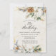 As flores brancas elegantes estão aninhadas em verde-pinheiros e minecones. O design floral é enquadrado por uma lavagem de aquarela de marfim mole, infundida com blocos de ouro macio. Perfeito para uma festa de aniversário de Natal ou de inverno.