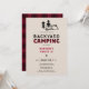 Um convite de festa simples, moderno, elegante e divertido para uma Sweet 16 com tema de acampamento ao ar livre, apresentando alguns elementos de acampamento (árvores, barraca, fogueira, lanterna), fontes colegiais e xadrez vermelho como uma sobreposição para o título "Acampamento" e para o verso. Um convite divertido para uma noite de diversão ao acampamento, bem no seu quintal!