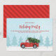 Este design apresenta um convite de festa de Natal com um caminhão vermelho vintage, design charmoso em aquarela, neve de inverno única, árvore de pinheiro, tipografia em pincel, caligrafia clássica, tradicionalmente caprichoso, festa de feriado, neve clássica