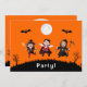 O convite de festas mostra três crianças felizes, saltando vestidas de Halloween como bruxa, vampiro, e pastor. Morcegos bonitos voam perto de uma lua branca. Dois lados. Personalizar ou personalizar todo o texto. O fundo é uma laranja de Halloween. Um produto em uma suíte de festas. Design para o feriado, bonito, divertido e alegre.