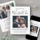 Se circunstâncias inesperadas causaram o adiamento da recepção do seu casamento, o primeiro aniversário é uma oportunidade perfeita para celebrar um ano depois. Convide familiares e amigos para uma festa de aniversário de 1 ano simplesmente elegante com este convite moderno e sofisticado de 2 fotos. Toda a redação é simples de personalizar, incluindo a citação que diz "um ano depois e ainda estamos juntos". Personalize a quantidade de tempo entre a cerimônia de casamento e a festa de aniversário, seja apenas alguns meses ou alguns anos. Inclua qualquer informação de sua escolha, como data do casamento, planos de renovação de votos, detalhes da festa pós-fuga, local da cerimônia de casamento subsequente, código de vestimenta, rsvp, site, etc. (DICA DE POSICIONAMENTO DE IMAGEM: Uma maneira fácil de centralizar uma foto exatamente como você deseja é cortá-la antes de fazer o upload para o site da Zazzle.) O design moderno minimalista preto e branco apresenta duas fotos dos recém-casados, caligrafia de script manuscrita na moda e tipografia estilo máquina de escrever chique. Quer você tenha fugido, tenha tido uma minimony ou micro casamento reduzido, ou a celebração do seu dia especial tenha sido remarcada devido a um adiamento relacionado à pandemia de covid, a festa feliz para sempre ainda pode começar. Parabéns à noiva