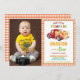 Personalize este convite de aniversário vibrante do Caminhão Vermelho da Colheita de Abóbora com a foto, nome, idade e detalhes da festa do seu filho de forma fácil e rápida, basta pressionar o botão personalizar para reorganizar e formatar o estilo e a colocação do texto. Ótimo para QUALQUER IDADE! Itens correspondentes disponíveis na loja! (c) THE HAPPY CAT STUDIO