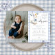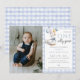 Este convite de foto para festa de primeiro aniversário encantador apresenta um pequeno ganso fofo segurando balões e um fundo xadrez azul. Criado por Thisisnotme©