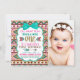 Convite de festa de 1º aniversário tribal para meninas com flechas tribais e laço azul escuro em um lindo fundo com design nativo americano sudoeste azteca. Você pode personalizar facilmente este adorável convite de primeiro aniversário tribal simplesmente adicionando sua foto e detalhes do evento. Este é um design impresso sem laços reais, glitter, etc.