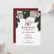 Convite de Rosas Brancas para Festa de 50 Anos de Casamento. Criado com cachos de rosas brancas e folhagens sobre um fundo branco com texto em burgundy profundo. O texto inclui: Por favor, Junte-se a Nós na Celebração dos 50 Anos de Casamento, em Homenagem, Nome do Casal, Data, Hora, Local, Endereço e Contato para Confirmação de Presença. O verso tem um fundo burgundy profundo correspondente. Para personalizar, basta inserir seus detalhes em nosso modelo fácil, substituindo o texto de exemplo. Certifique-se de ver os cartões e acessórios correspondentes.