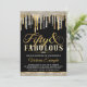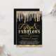 Convite de festa de 50 anos fabulosa preto e dourado com elegantes diamantes e gotas douradas em fundo preto. Este convite de 50 anos de idade de mulher preto e dourado é facilmente personalizado para o seu evento, basta adicionar seus detalhes no estilo de letra, cor e texto de sua escolha. Você também pode alterar a cor do fundo nas páginas frente e verso.