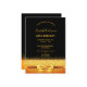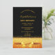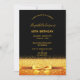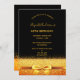 Um convite moderno, elegante e glamoroso para a festa de 60 anos de uma mulher. Um fundo preto chic com um arco e fita dourados falsos elegantes e brilho. O nome é escrito com uma fonte moderna dourada de letra manuscrita. Modelos para os detalhes da sua festa.
