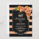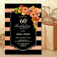 Convite de festa de 60 anos tema floral listrado de coral preto e brilho artificial.