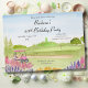 Esta encantadora aquarela apresenta um campo de golfe ladeado por pinheiros e um alegre carrinho de golfe rosa, emoldurado por astilbe rosa suave e sálvia russa em flor - criando um ambiente alegre e sereno perfeito para a celebração de 65 anos.