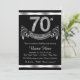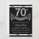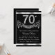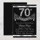 Convite de festa de 70 anos preto e prata elegante com números de diamante e faixa em um fundo prateado e preto. Este convite de festa de 70 anos preto e prata é facilmente personalizado para o seu evento. Este design impressionante funciona bem para homem ou mulher. Este é um design impresso sem diamantes reais, prata, glitter, etc.