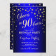 Convite de festa de 90 anos para mulheres ou homens. Design elegante com dourado brilhante falso e azul real. Caracteriza fonte manuscrita e confetes. Um brindes a 90 Anos! Perfeito para uma celebração de aniversário de estilo marcante.