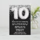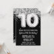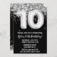 Convite de 10 anos preto e branco para dez anos, com prata branca preta, com escrevendo moderno e balões de folha divertida.