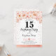 convite de aniversário 15. Design elegante em ouro brilhante de rosa com sotaque floral. Convide cartão com fonte de script e confetti. Coral cor-de-rosa, branco. Perfeito para uma comemoração de na moda 30 dias. Envie-me uma mensagem se precisar de idade personalizada.