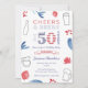 Saúde e Cerveja a 50 anos com estes Convites de festas de aniversários vermelhos e azuis. A coloração tornaria o design particularmente adequado para um evento em torno de um feriado nacional, por exemplo, 4 de julho, ou para quem quiser manter as Estrelas e Stripes em exposição.
