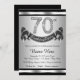 70 de prata com números de diamante e banner de aniversário feliz em um fundo prateado e preto. Este belo convite de aniversário prateado é facilmente personalizado para o seu evento. Você pode alterar a cor de fundo. Esta design surpreendente funciona bem para um homem ou uma mulher. Este é um design impresso sem diamantes reais, prata, brilho, etc.